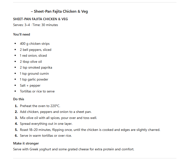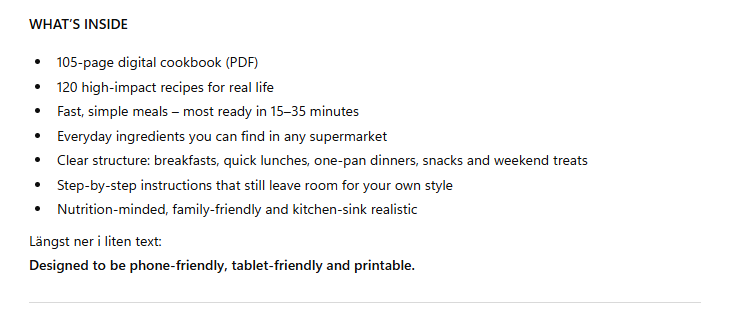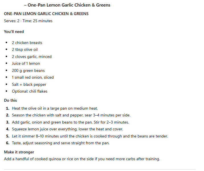 A clean, practical 105-page cookbook with 120 high-impact recipes, full macros per serving, smart swaps, structured menus, and a batch-prep routine that keeps your week running smoothly.