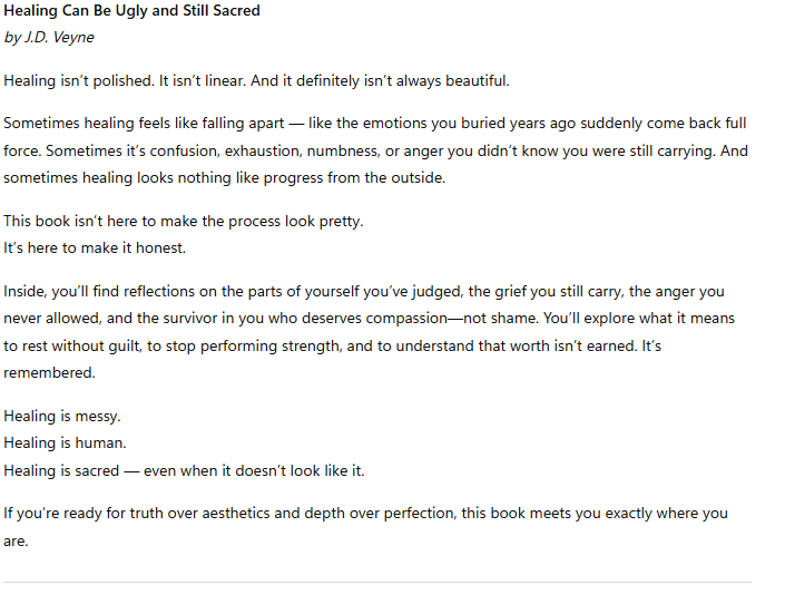 A compassionate, unfiltered guide to real healing — messy, nonlinear, emotional, and deeply human. This book helps you understand your own process with clarity, honesty, and grounded strength.