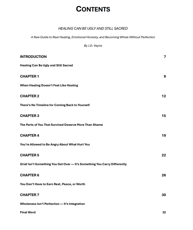 This book explores the real process of healing: the anger you’ve suppressed, the grief you still carry, the parts of yourself you’ve judged, and the versions of you that survived more than anyone knows. It’s a grounded, honest guide for those who want depth over aesthetics and truth over performance.