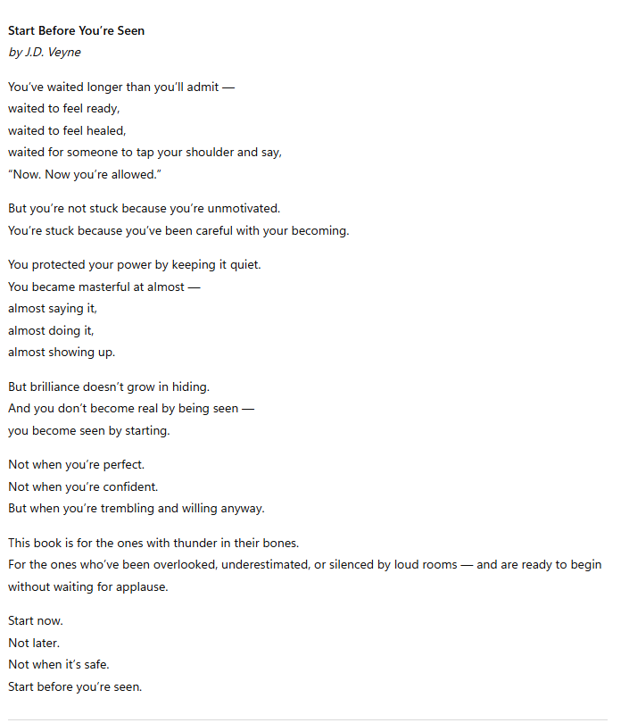 This book is for the quiet powerhouse, the late bloomer, the person who’s been preparing for years but hesitating at the doorway of their own potential. It’s about starting before you feel ready, before you’re certain, before anyone is watching.
