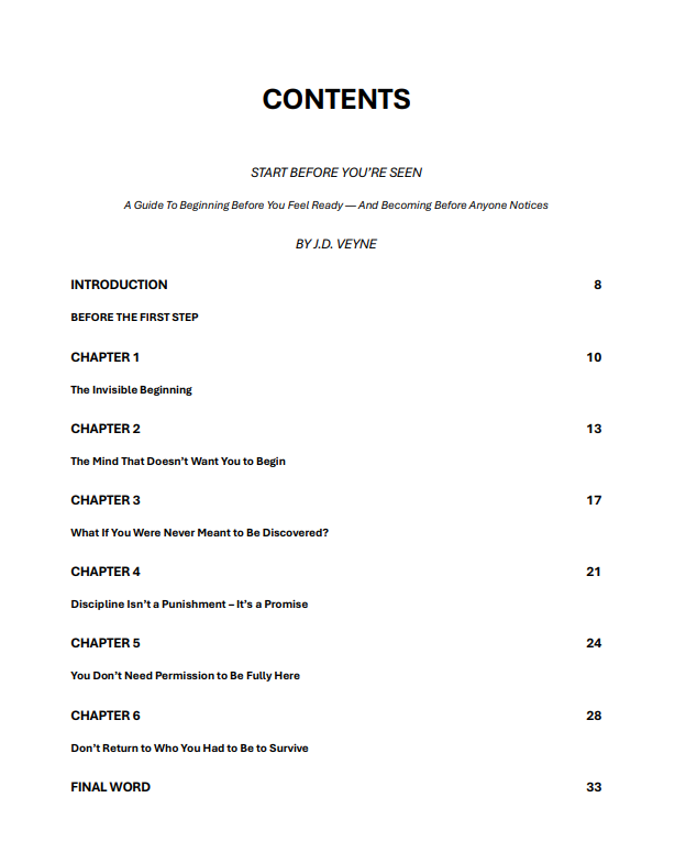 A raw, honest guide about beginning before you feel ready. This book teaches you how to move through doubt, break hesitation loops, stop waiting for permission, and step into your becoming — even when no one is watching.